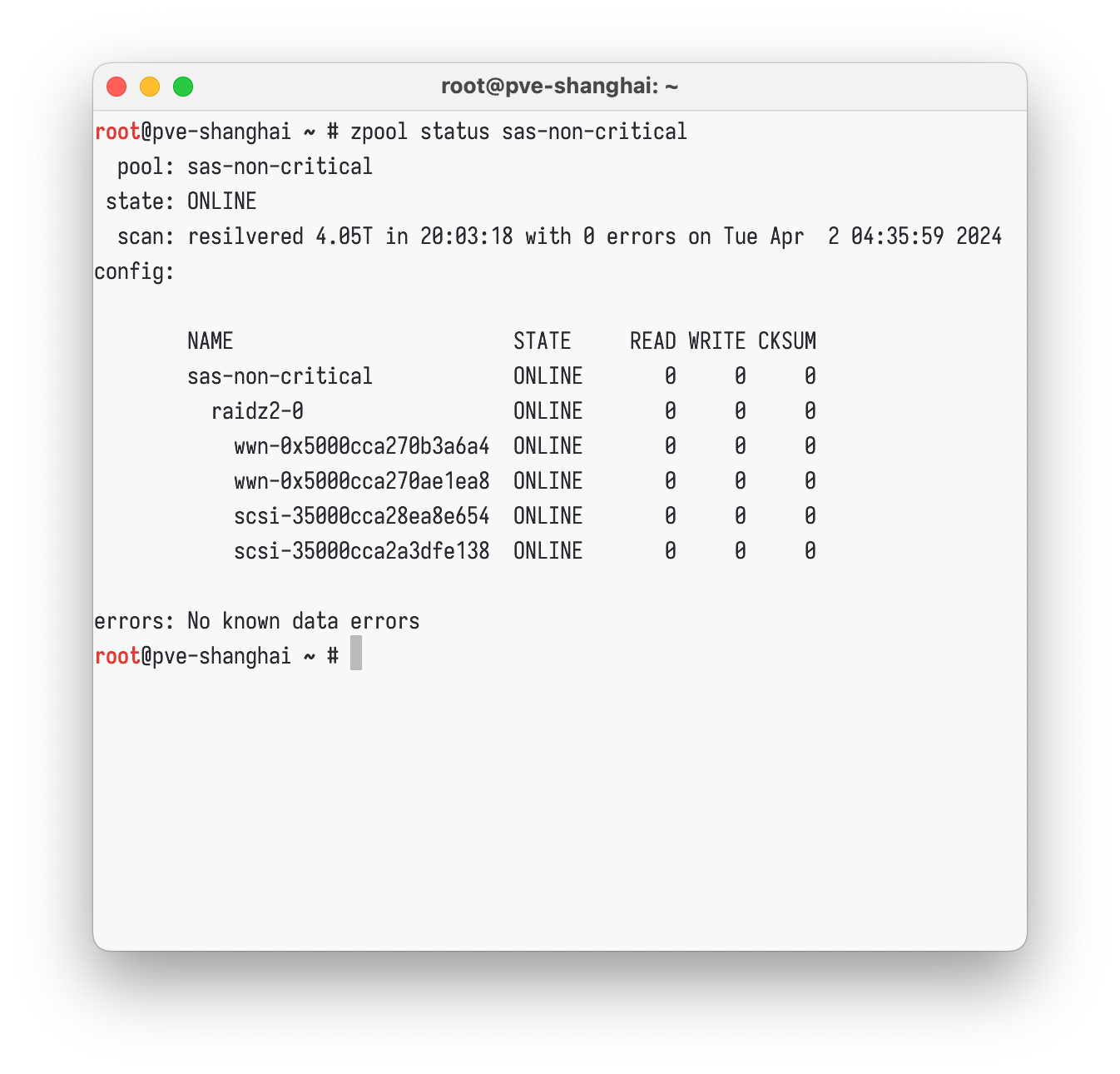整个过程其实可以很简单:掏四块盘出来新建新的 pool,然后 zfs send | zfs receive 拷贝一下内容,就好啦。但是我并没有闲置的四个硬盘来创建新的 pool,于是就得想一些 tricky 的办法绕一绕:RAIDz2 至少需要四块硬盘,其中两个盘存放校验,剩下的 N-2 块硬盘存放数据,所以其实这个模式是允许只有两个硬盘在线的,那么思路就有了:先用真的硬盘和假的文件打个哈哈创建出 pool,再离线掉那俩文件,就可以得到一个降级运行(degraded)的 pool 了,最终的全过程如下: